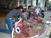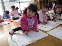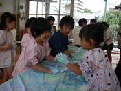 3歳児では力いっぱいぐるぐる描きを楽しむ,4歳児では全身で絵具遊びを楽しむ,5歳児では自分たちで遊んだ絵の具遊びからさらに展開させて遊ぶなど,年齢に応じた絵の具遊びや製作遊びをしています。友達と一緒に,自分の思いを十分に表現することを楽しんでいます。