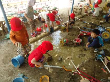 各幼稚園の砂場では,子どもたちが大きな山を作ったり,トンネルを掘ったり,水を流して遊んだり,子どもたちが思い思いの遊びをしています。その遊びを通して,子どもたちは多くのことを学んでいきます。